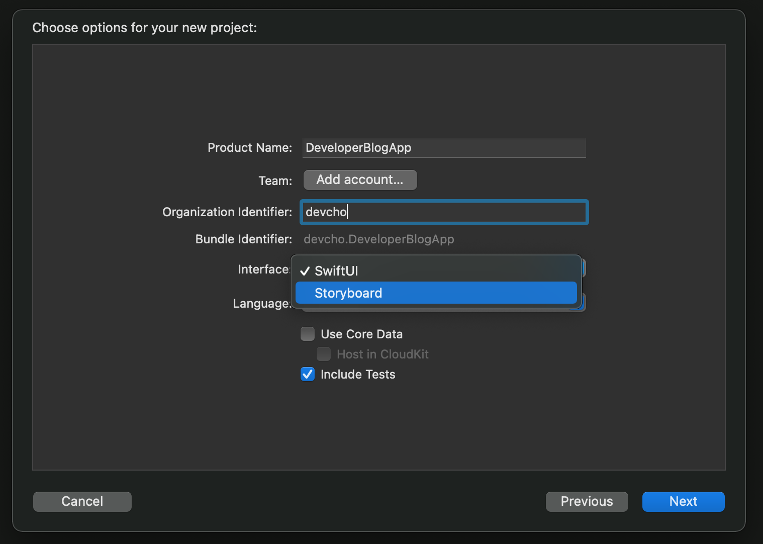 3. Interface의 기본값은 SwiftUI이다. 이를 눌러 Storyboard로 바꾼다.
