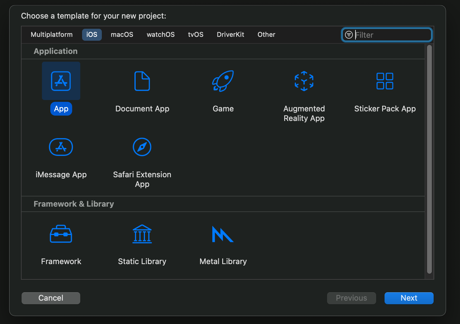 2. iOS 탭의 App을 누른 후 Next를 누른다.