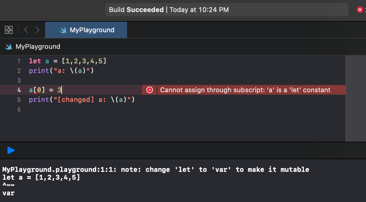 error: MyPlayground.playground:4:1: error: cannot assign to value: 'a' is a 'let' constant