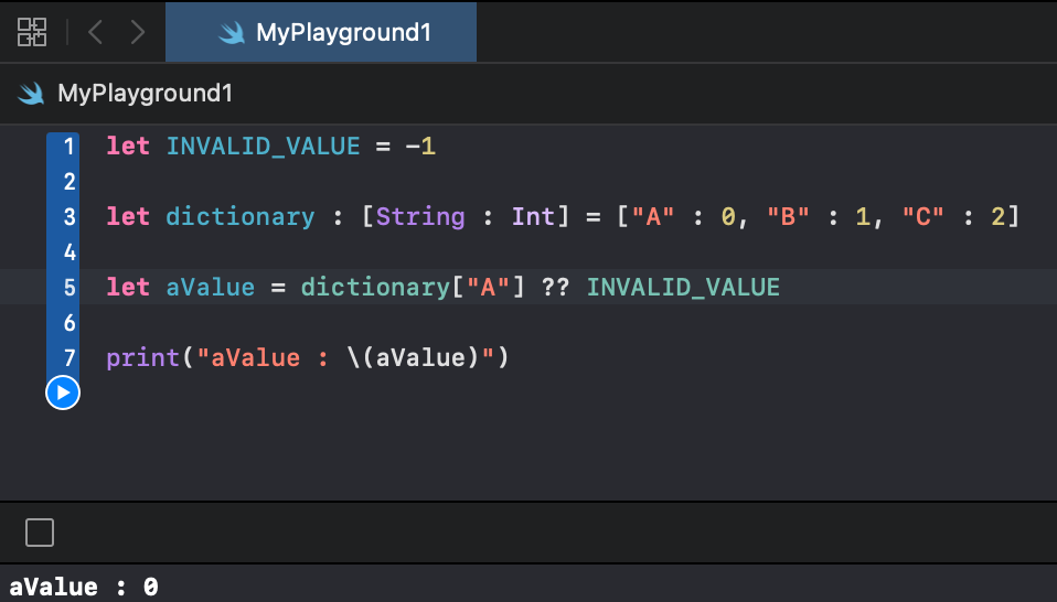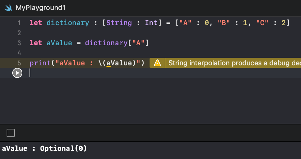 실제 사용을 보자. Dictionary에 "A" 키는 0에 대응되므로 aValue의 값이 nil이 아니다. 따라서 0이 출력되는 것을 확인할 수 있다.
