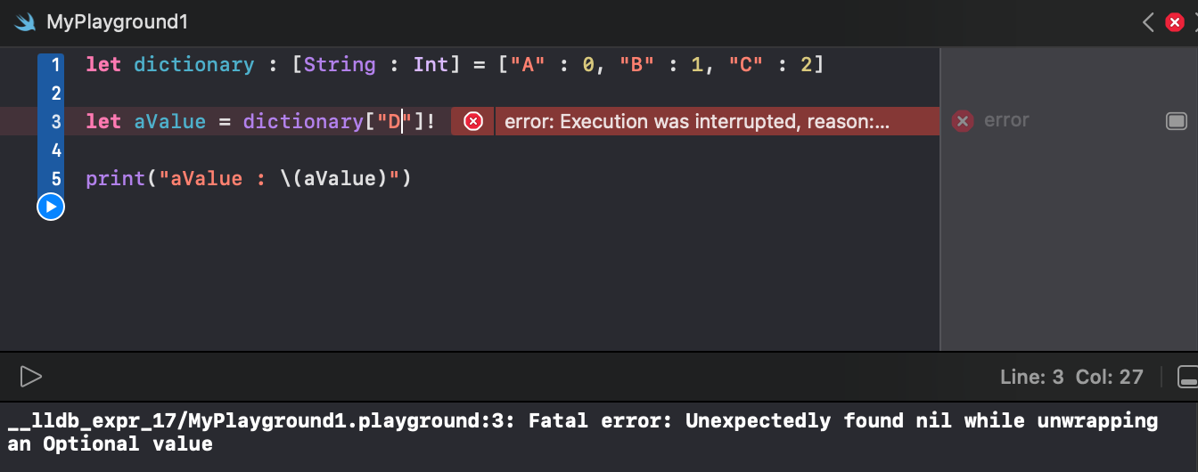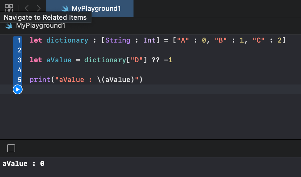 위 그림3에서 "D" 를 Key 값으로 써서 Optional 내부를 nil로 만들었던 상황을 보자. aValue 값을 프린트 해보면 -1이 나오는 것을 확인 할 수 있다. Optional(nil)이 옵셔널이 풀리면서 -1로 대체되었기 때문이다.