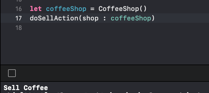 위 예제에서 만든 class CoffeeShop 객체를 생성하여 이 자리에 오도록 해보자. CoffeeShop은 Shop protocol을 상속 받으므로 Shop이 들어가야 할 자리에 올 수 있다. 즉, Shop 타입을 받는 자리에 Shop 타입을 구현하는 CoffeeShop이 올 수 있다.