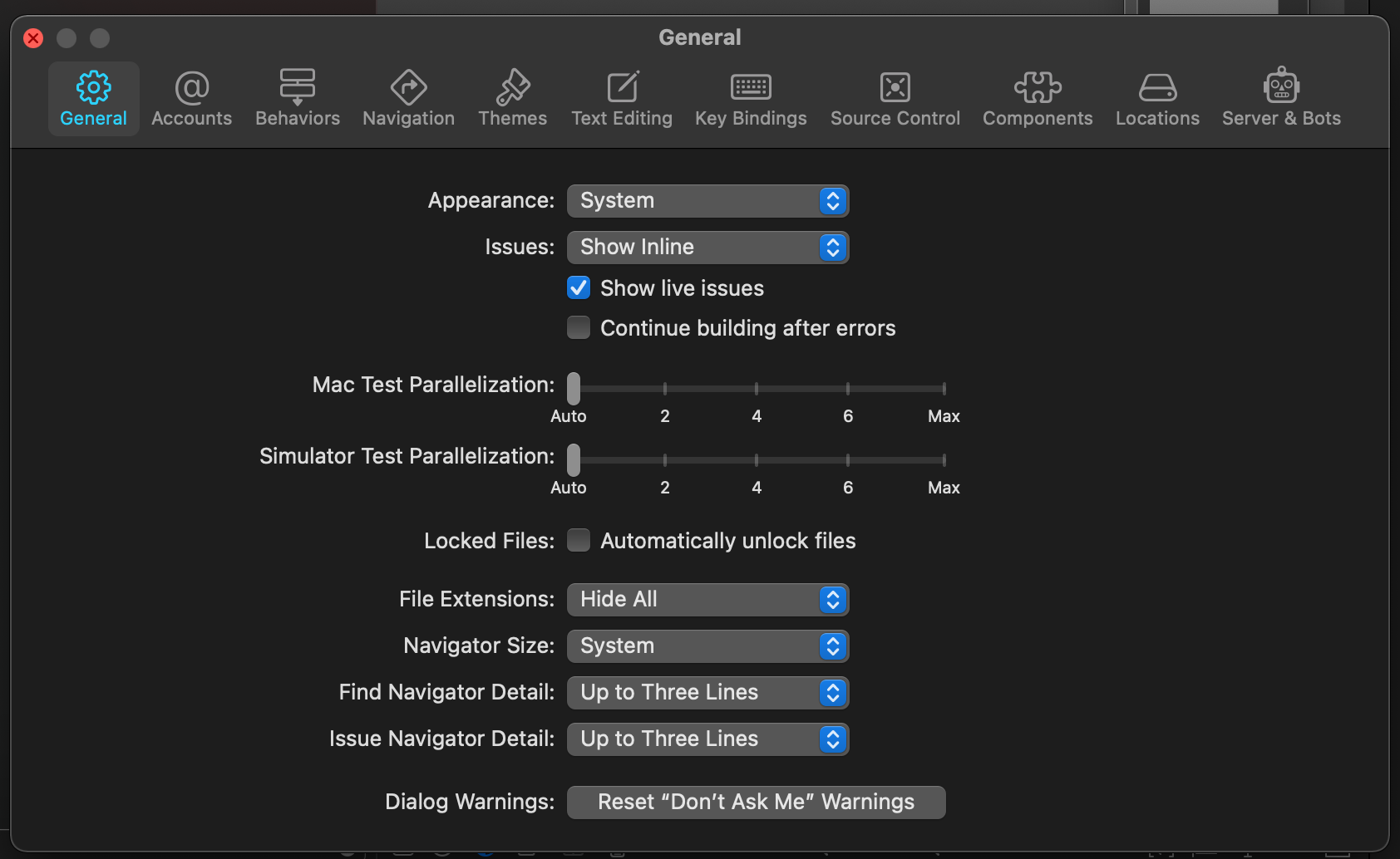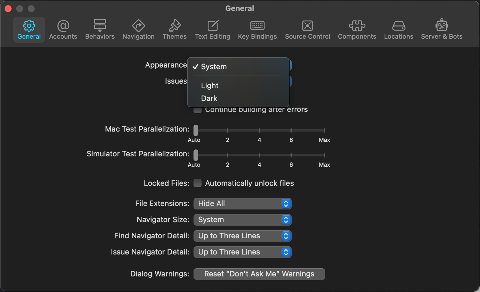 Xcode는 기본적으로 System의 Mode를 따라간다. 하지만 System은 Light 모드로 해놓았더라도 코드를 짤 때 Light 모드로 해놓으면 눈이 아프므로 Dark Mode로 설정하고 싶을 수 있다. Xcode에서는 해당 Mode를 설정하는 옵션을 제공한다.
