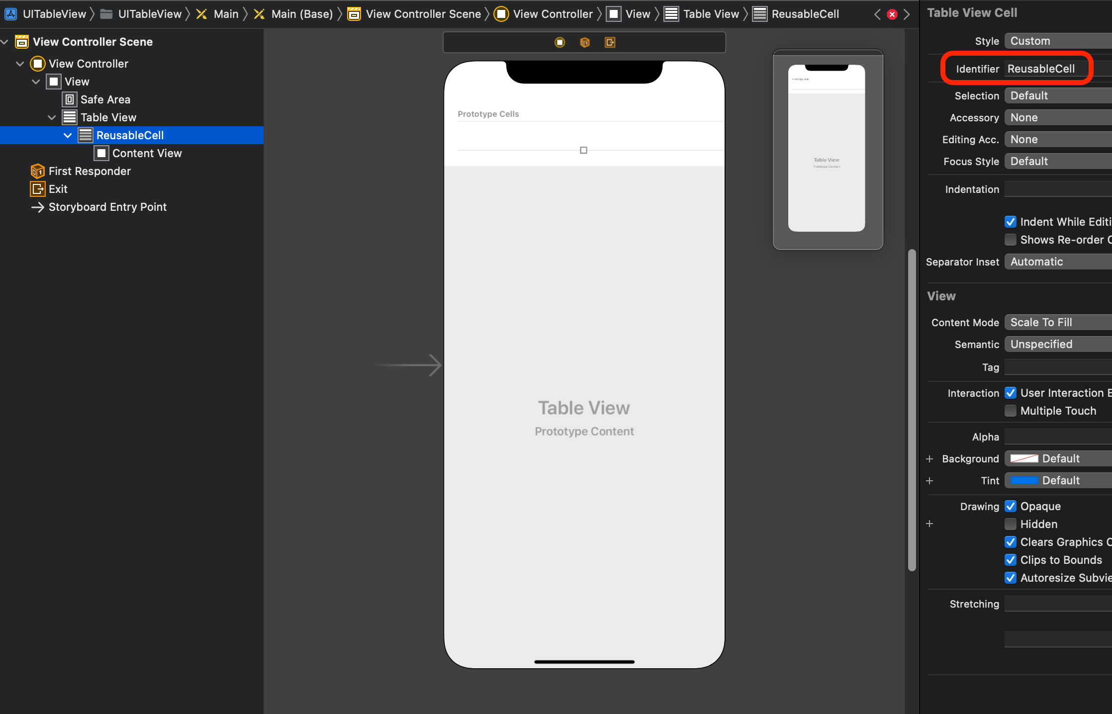 1. TableView는 TableView에 TableViewCell을 넣는 형태로 만들어진다. 따라서 TableViewCell을 만들 수 있도록 다음과 같이 구조를 만들도록 하자. 이 때 TableViewCell의 Identifier은 ResuableCell이 된다.
