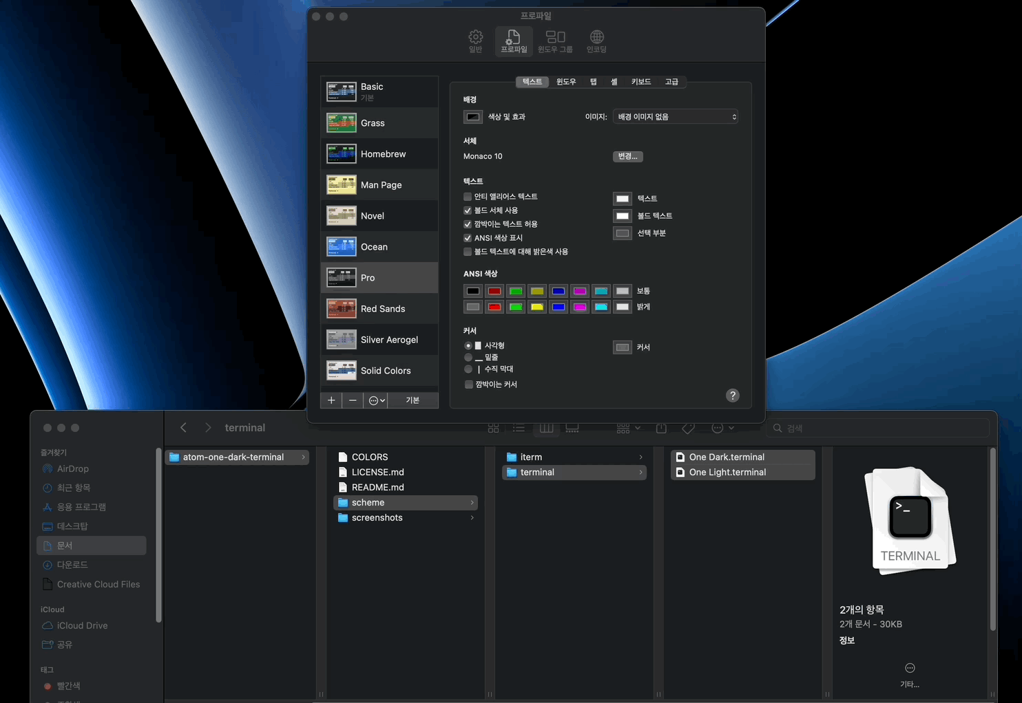 Mac의 기본 터미널은 파일과 폴더 구분은 물론, 검은색과 흰색만 가지고 있다. 이 곳에 테마를 적용하는 방법을 살펴보자.