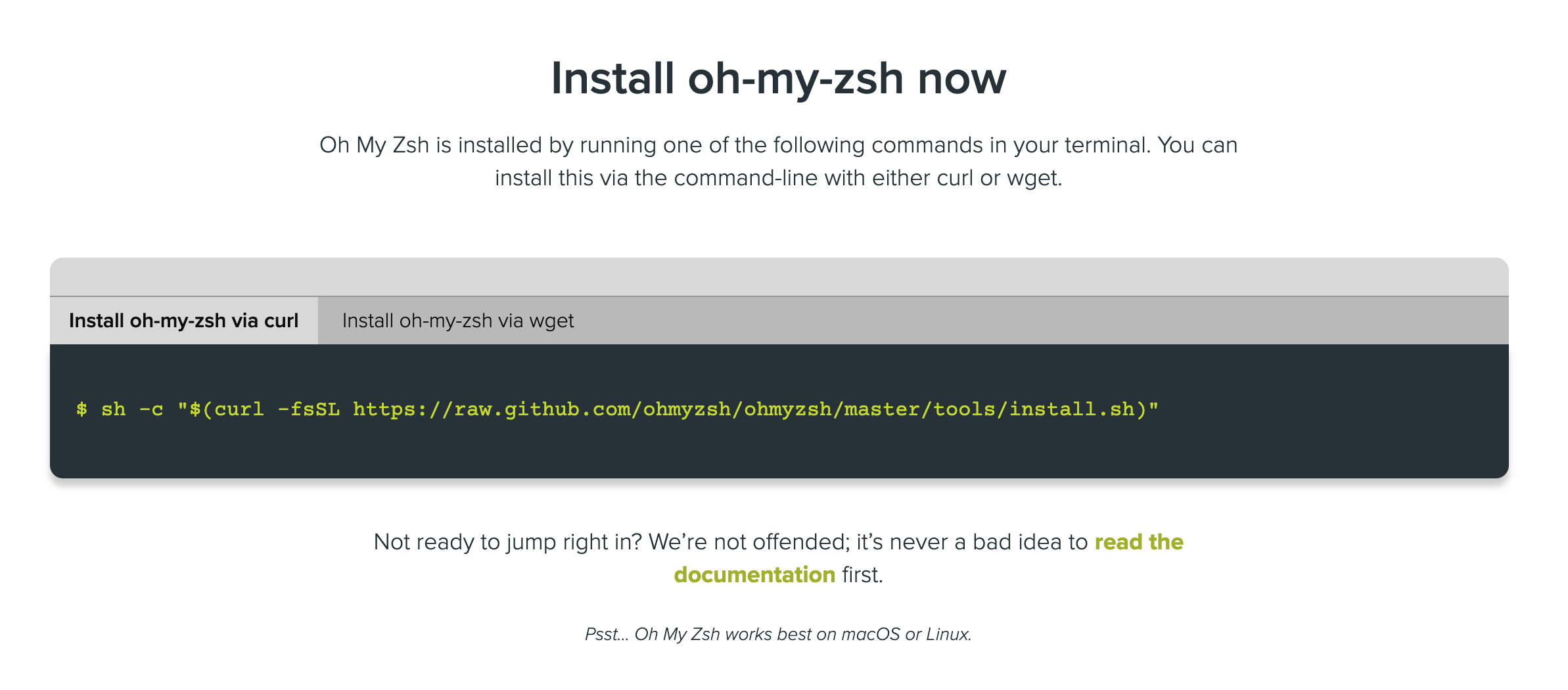 ohmyzsh 홈페이지에 접속해 ohmyzsh 를 설치한다.