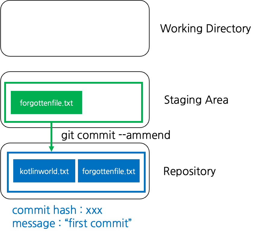 git commit --ammend 명령어는 Staging Area 에 있는 파일을 이전 커밋에 더해주는 역할을 한다.