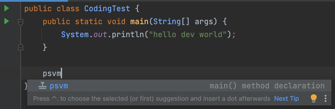 Intellij에서는 public static void main의 약자인 psvm을 사용해 main 메서드를 생성 할 수 있다.