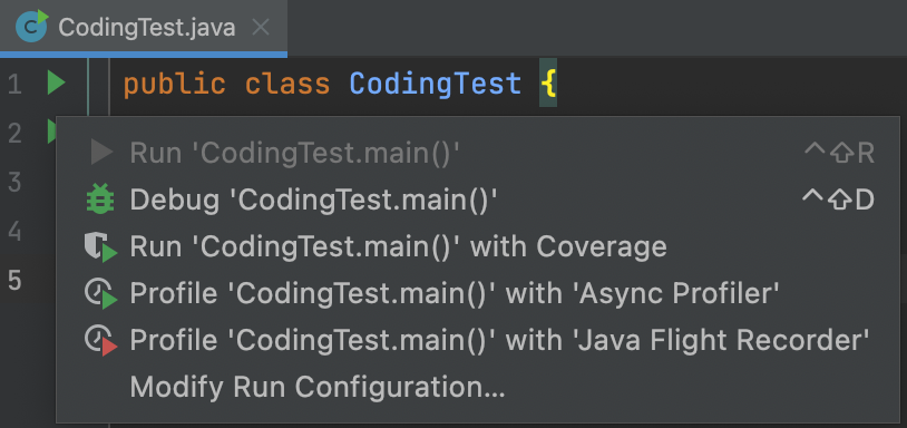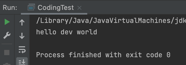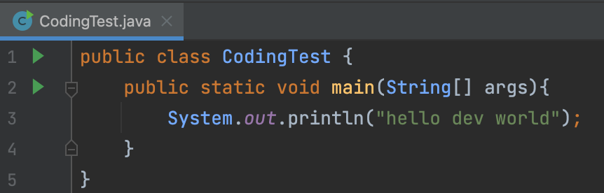 이 main 함수는 static 메서드로 구현되어 있으며, 보통 왼쪽에 재생 화살표가 뜨는데 이 버튼을 누르면 main 함수가 실행된다.