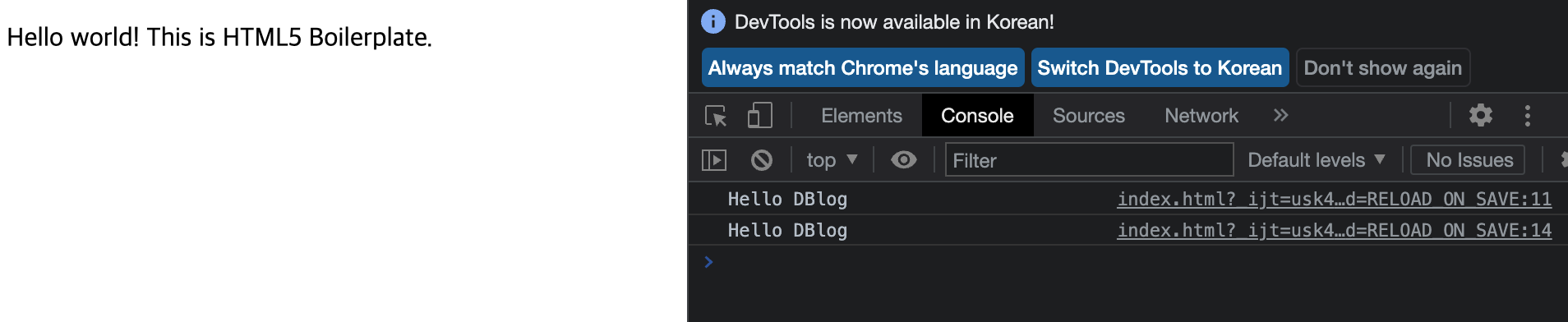 위 HTML파일을 크롬에서 실행하면 다음과 같이 Hello DBlog라는 로그가 두 번 출력되는 것을 확인할 수 있다.