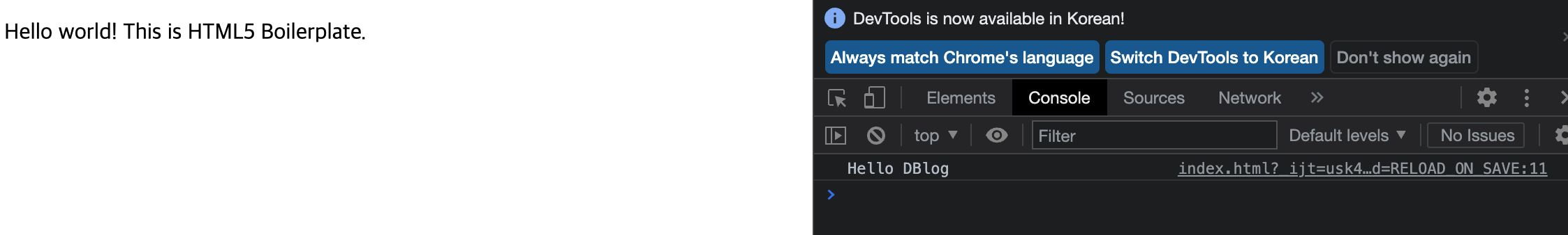 이제 이 코드를 HTML 파일 내부에 넣으면 HTML파일이 실행될 때 Hello DBlog라는 로그가 출력되게 된다.