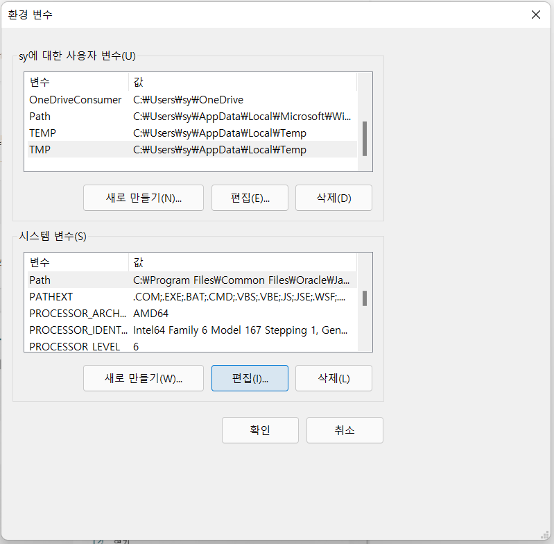 5. 시스템 변수의 Path에 커서를 둔 다음 더블클릭을 하거나 편집을 누른다.