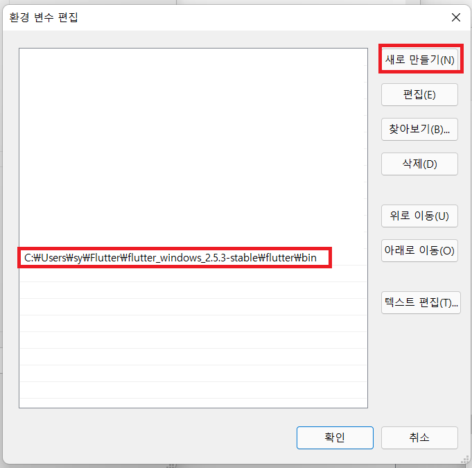 6. 새로 만들기를 누른 후 1에서 압축을 푼 폴더의 flutter/bin 위치를 지정한다.